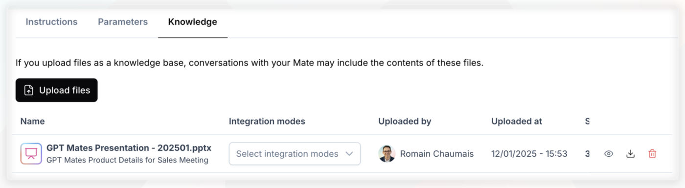 Users can manage a Mate's "Knowledge" files via the "Knowledge" tab in the Mate's settings.